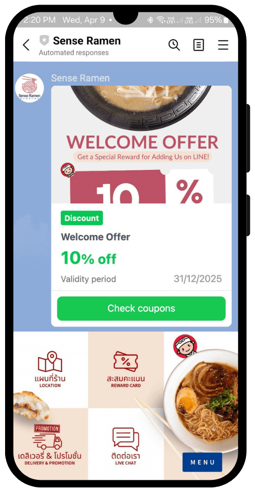 เหมาะสำหรับการโปรโมทและเพิ่มลูกค้า (แจกคูปอง & ใช้ Rich Menu นำทาง)